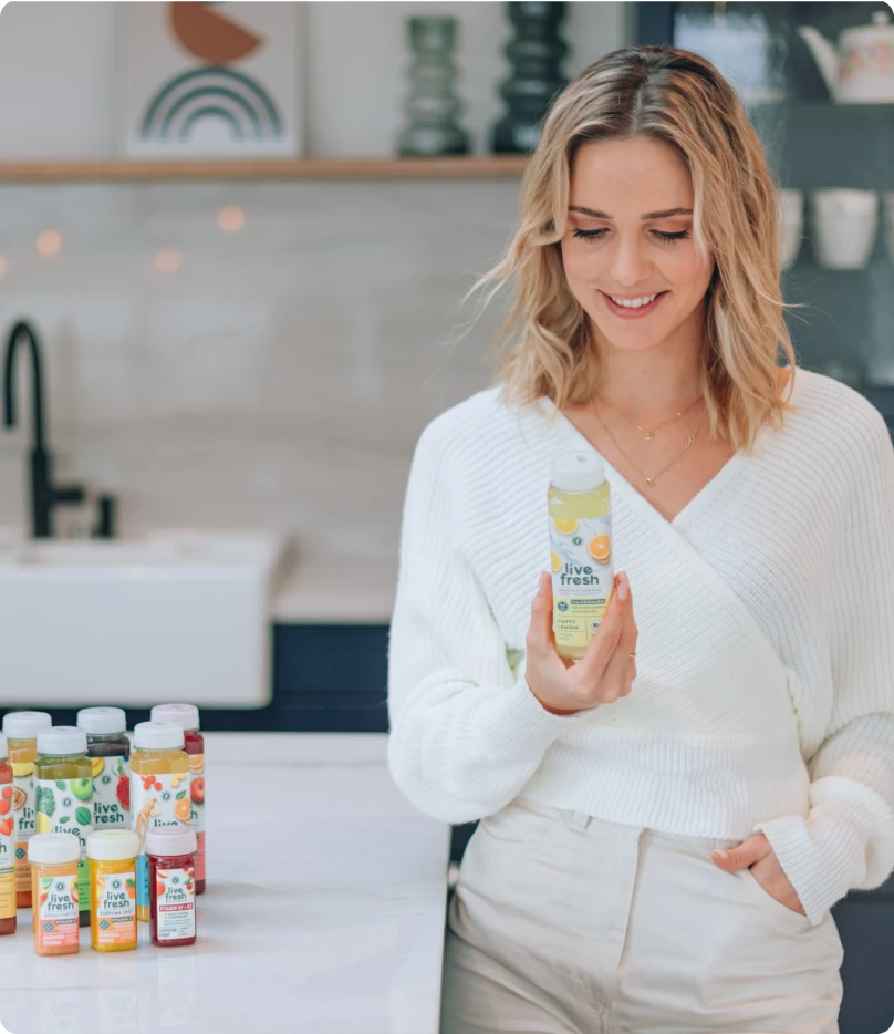 Blonde Frau in weißem Pullover und heller Hose steht lächelnd in einer dunklen Küche. Links neben ihr stehen verschiedene Säfte von LiveFresh, außerdem Obst und Gemüse wie Sellerie. Sie sieht auf den Saft in ihrer Hand.