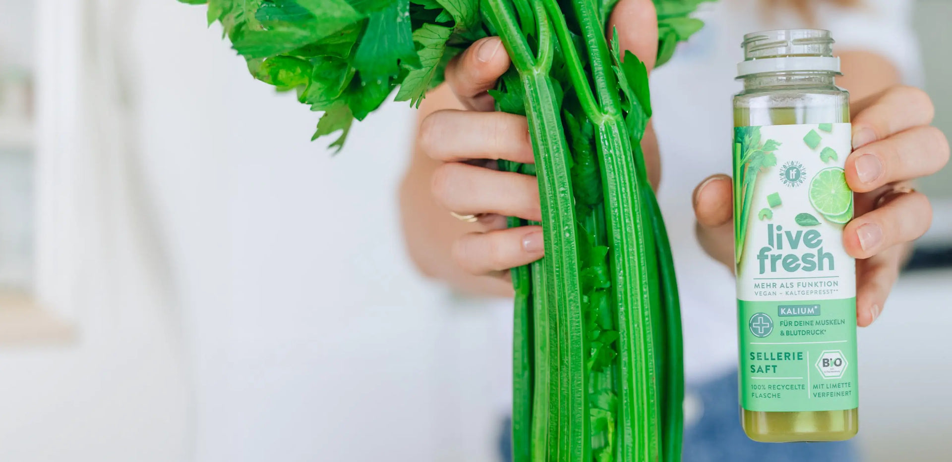 Selleriesaft von LiveFresh schmeckt viel milder als es seine Farbe vielleicht vermuten