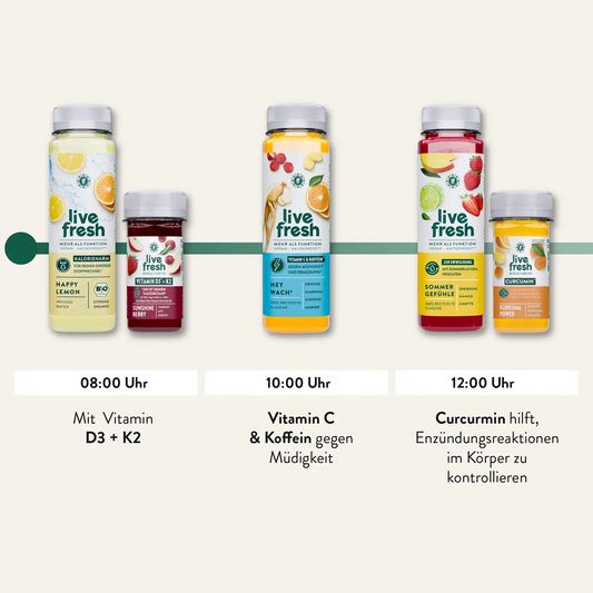 Unsere Säfte sind so entwickelt, dass sie Euch über den Tag hinweg gezielt mit den richtigen Vitaminen und Mineralien versorgen – genau dann, wenn Euer Körper sie braucht.